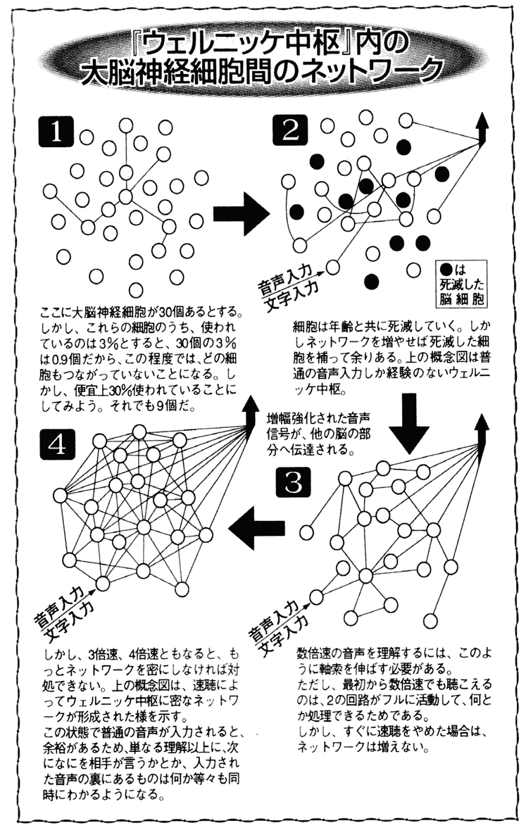 しかし、これらの細胞のうち、使われているのは3%とすると、30個の3%は0.9個だから、この程度では、どの細胞もつながっていないことになる。しかし、便宜上3%使われていることにしてみよう。それでも9個だ。 細胞は年齢と共に死滅していく。しかしネットワークを増やせば死滅した細胞を補って余りある。上の概念図は普通の音声入力しか経験のないウェルニッケ中枢。 しかし、31音速、4倍速ともなると、もっとネットワークを密にしなければ対処できない。上の概念図は、速聴によってウェルニッケ中枢に密なネットワークカ形成された様を示す。 この状態で普通の音声が入力されると、余裕があるため、単なる理解以上に、次になにを相手が言うかとか、入力された音声の裏にあるものは何か等々も同時にわかるようになる。 数倍速の音声を理解するには、このように軸索を伸ばす必要がある。 ただし、最初から数倍速でも聴こえるのは、2の回路がフルに活動して、何とカヽ処理できるためである。 しかし、すぐに速聴をやめた場合は、ネットワークは増えない。(引用) |