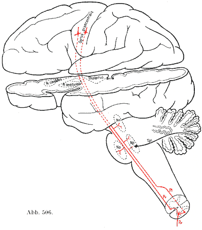 ただし、錐体路が解剖学的な実体であるのに対して、「錐体外路」という神経路は解剖学的には実在しない。 錐体を通らずに抹消へ運動の指令を伝える経路を錐体外路。 錐体外路性運動系は脳のさまざまな部分が協調して統合しているので、どこが中枢かは必ずしも明確でない。特に重要と考えられている部分は、線条体、淡蒼球、中脳の赤核と黒質、そして小脳である。大脳基底核からの出力の多くは大脳新皮質運動野を介して出力される。 |