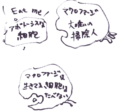 掃除屋マクロファージがアポトーシスな細胞(おまえはもう死んでいる 宣告されて崩れ行く細胞)をぼっこぼこ食べる。
